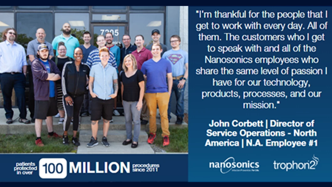 I'm thankful for the people that I get to work with every day. All of them. The customers who I get to speak with and all of the Nanosonics employees who share the same level of passion I have for our technology, products, processes, and our mission.John CorbettDirector of Service Operations – North America | N.A. Employee #1
